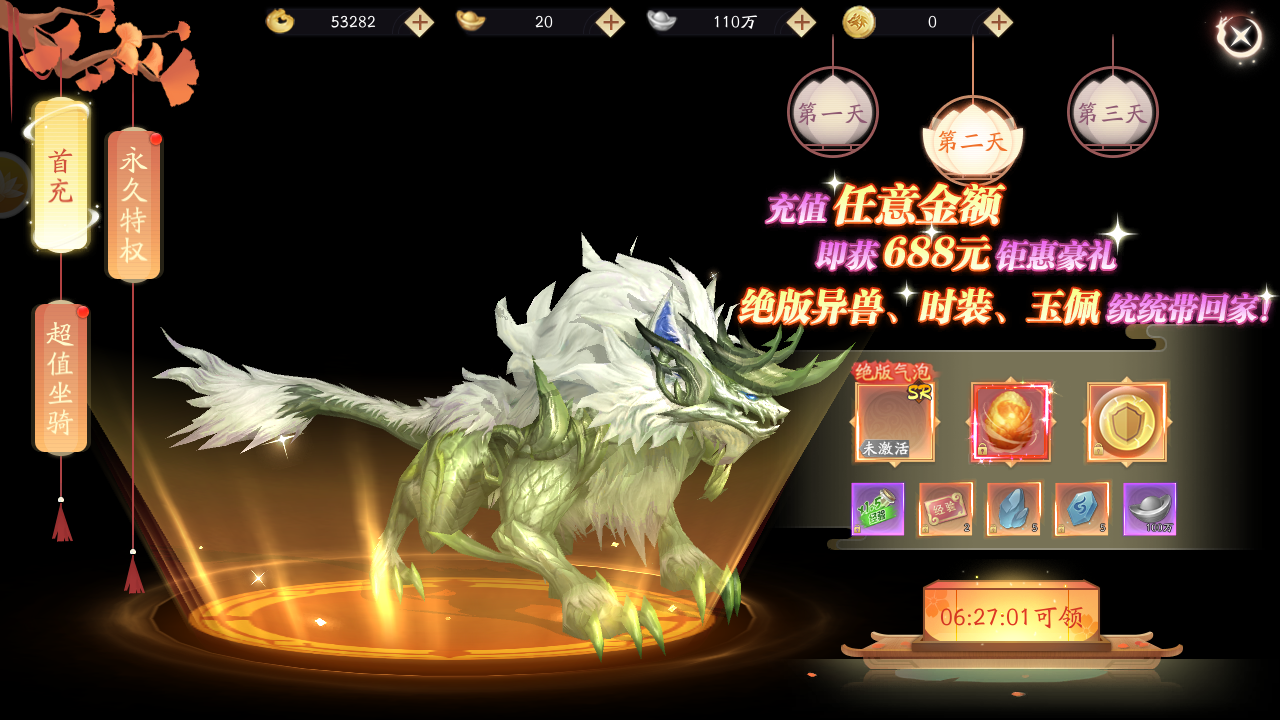 福利1: 魂息舞獅幻化*1、口糧*10、坐騎進階丹*50
